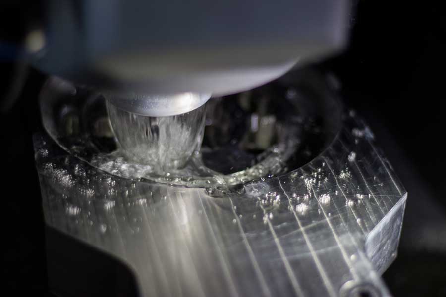 Je nach Werkstoff wird entweder Im Nass- oder im Trockenverfahren gefräst.
