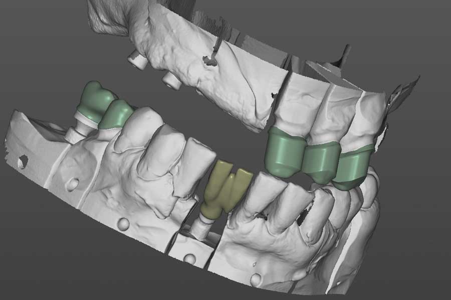 Stand in der Vergangenheit bei der Erstellung von Zahnersatz noch das Handwerk im Vordergrund, so verdrängen zunehmend digitale Workflows altbewährte handwerkliche Arbeitsprozesse. Wie funktioniert das? Zunächst wird die Mundsituation des Patienten in Form von dreidimensionalen Bildern digital erfasst, in einem Konstruktionsprogramm zur Bearbeitung gespeichert und dann auf den Computerbildschirm projiziert (siehe Bild rechts). So wird die Konstruktion von zahntechnischen Bauteilen, Baugruppen und Hilfsmitteln ermöglicht. Abgespeichert werden diese Daten als sogenannte „STL-Files“ (Surface Tesselation Language).