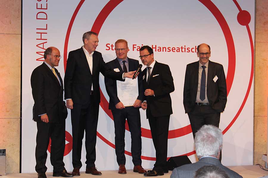 Die Geschäftsführer Sven Davidsmeyer und Frank Laux erhalten den Preis „Innovatives Handwerk 2017“ in der Kategorie „Innovation und Nachhaltigkeit“ beim 51. Mahl des Handwerkes. Die Entscheidung der Jury erläutert Moderator Dirk Böhling: